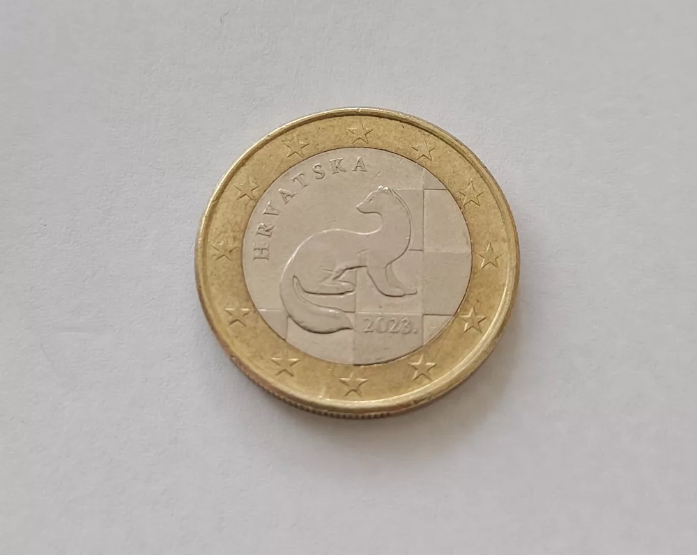 Die 1-€-Münze von Kroation zeigt einen Marder vor einem Schachbrettmuster.