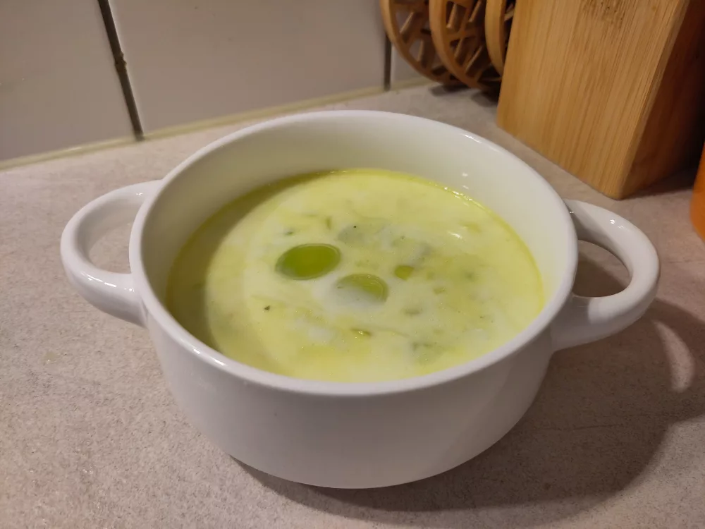Eine Suppentasse gefüllt mit einer Portion der Käse-Lauch Suppe