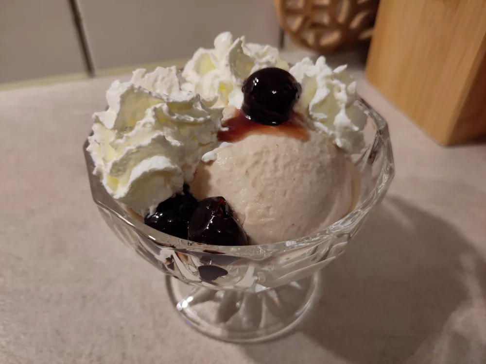 Ich habe in meinem kleinen Vorrat hier auch ein paar wenige Gläser alkoholfreie Maraschino Kirschen in Sirup. Mittlerweile ist dieser Vorrat etwas geschrumpft und mit daran Schuld ist auch diese Eiscreme, die ich mir als Dessert mit etwas Sahne und ein paar zusätzlichen Kirschen zu meinem Weihnachtsessen gemacht habe.
