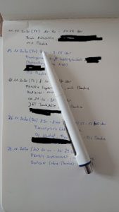 Ich habe mein Kontakttagebuch gepflegt. Nun, bei mir ist der Begriff „Tagebuch“ zu weit gefasst. Es sind bisher, seit dem ich den Aufschrieb begonnen habe, zwei Seiten gewesen. Aber es umfasst aktuell alle dokumentierbaren Begegnungen, die ich aktuell so habe. Ja, Supermarktbesuche trage ich da auch ein, manches mal auch Paketzusteller, wenn ich bei der Tankstelle war oder wenn ich sonstige Termine wahrnehme.